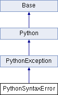 Inheritance diagram for PythonSyntaxError:Public Member Functions | |