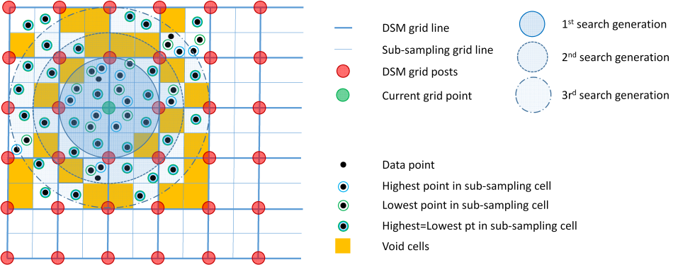 The generation based point selection works as follows. First, a sub-sampling grid is constructed (thin blue lines) such that each grid cell of the final DSM (thick blue lines and red circles, respectively) is composed of four sub-sampling grid cells. Within each cell of the sub-sampling grid the highest point is determined (black point surrounded by blue circle) and stored as the representative point of this cell. As a by-product also the lowest points are detected and and stored (black points surrounded by green circles). Depending on the point density and point distribution, some of the sub-sampling cells may not contain points and, thus, are marked as void. Please note, that although the (highest) points are now organized in a raster, allowing fast nearest neighbour point queries, still the original points with their arbitrary 3D positions and attributes are maintained. To interpolate the height of a specific grid point (green circle), the k-nearest neigbouring points are queried from the sub-sampling raster (highest points per cell) in a generation based manner. The first generation contains all cells whose cell centers are located in a circle with a radius equal to the DSM grid size. If the number of valid data points is less than the requested neighbour count (neighbours) the search radius is extended by the size of the sub-sampling grid (i.e. half of the DSM grid size). All (cell) points of the resulting circular ring (i.e. 2nd generation) are added. The procedure is repeated unit either the requested neighbour count or the maximum search radius is reached. The DSMmls grid height is subsequently interpolated by fitting a tilted plane (cf. Module Grid for further details). The DSMmax height, in turn, is strictly derived from the four sub-sampling grid cells sorrounding the grid point by selecting the highest cell. The DSMmax grid cell remains void if all four adjactent sub-sampling grid cells are void. The DSM height for the current position is finally obtained by choosing either the height of DSMmax or DSMmls, respecively, depending on the local surface roughness (maxSigma). The latter is obtained as a by-product of the moving planes interpolation. The DSMmax is chosen if a valid maximum height exists at the current location and if the local sourface roughness is greater than the specified threshold, otherwise the DSMmls is used. For more details please refer to Hollaus et al., 2010.