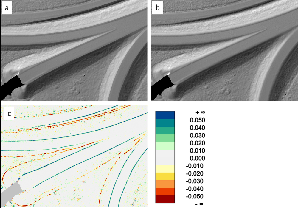 Figure 3 shows a detail of the shaded DTM relief compared to a variant without considering the breaklines in the surface interpolation (Module Grid):