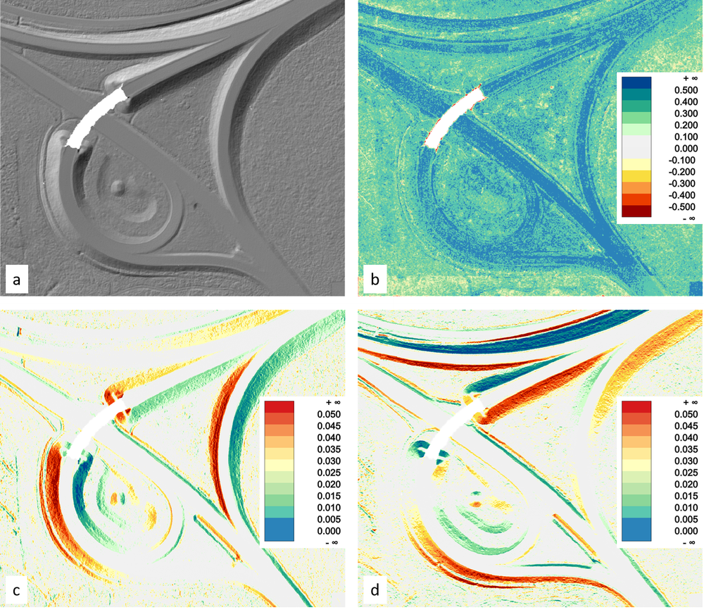 Visualizations of the resulting raster files (DTM shaded relief map, color coded sigmaZ, normalx and normaly map) are plotted in Figure 1: