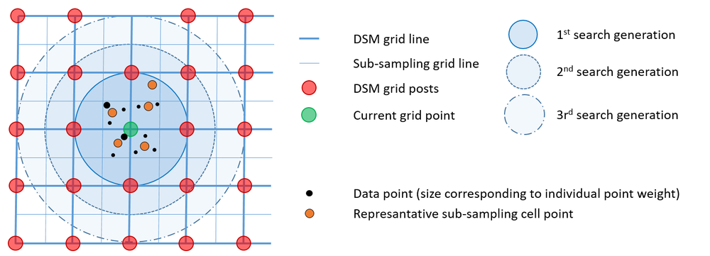 Data selection works as follows: The output grid structure is sub-sampled so that each output DTM grid cell is divided into four sub-sampling cells. The data points are then sorted into these sub-sampling cells. If more than one points falls within such a cell, a represantative point is calculated based on weighted center-of-gravity calculation. Therefore a user defined weight funtion can be specified (weightFunc). As a pratical example for this, the user might want to favor points with a higher (raw) amplitude or (calibrated) reflectance over points with low signal strength. In this case the respective point attributes (amplitude, reflectance, intensity, etc.) can directly used as weight function but, however, arbitrarily complex weight functions can be specified in gerneric filter syntax. Once all the points are sorted into the respective subsampling cell, the generation based point selection starts with a search radius equal to the DTM grid size. In the 1st> generation all sub-sampling grid cells with a maximum distance to the investigated grid post of 1 * DTM grid width are considered. If the number of neighbouring points is less then the requested knn-count (neighbours) the search radius is extended by one sub-sampling grid cell (i.e. half of the DTM grid spacing) and all points of the circular ring are added. The procedure is repeated until either the knn point count is greater than or equal (neighbours) or the maximum search radius (searchRadius) is reached. Please note that, although this is a raster based point selection approach, still the arbitrary positions of the representative cell points are maintained. In addition to the point data, all line data in the vicinity of the grid goint are considered within the interplation.