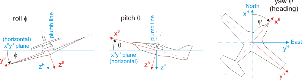 The entire rotation matrix \(\mathbf{R}_B^H\) transforms a point from the body system \(B\) into the system of the local horizon \(H\):