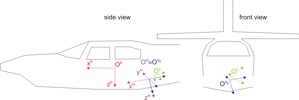 We suppose that we have a strapdown inertial navigation system (INS), i.e. the inertial platform is fixed with respect to the aircraft's body. Consequently, its measurements are given in a body(-fixed) system \(B\). Its axes are defined as follows: \(x^B\): forward, \(y^B\): right, \(z^B\): down. Furthermore, we suppose that its origin corresponds to the current (interpolated) position of the flight trajectory.