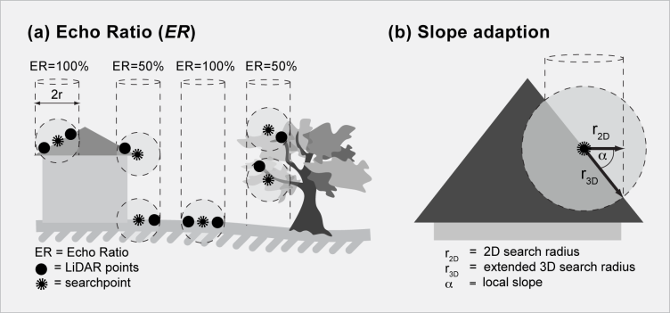 with n3D <= n2D, n3D = no. of neighbors found in a fixed search distance measured in 3D (i.e. search sphere) and n2D= no. of neighbors found in same distance measured in 2D (i.e. vertical search cylinder with infinite height). For impenetrable (flat) surfaces (bare ground) the echo ratio is (nearly) 100%, whereas the echo ratio decreases for penetrable surface parts (vegetation), since there are more points in a (vertical) search cylinder than there are points in a sphere with the same radius. With increasing surface slope (eg. roofs, walls), even if the surface is fully solid, the ER gradually decreases. To guarantee a high ER in steep impenetrable areas, the 3D search distance has to be extended considering the local surface slope. This is done by dividing the initial 3D distance by the cosine of the surface slope (r3D=r2D / cos(alpha)). Thus, the availability of local surface normal vectors is a prerequisite for deriving the slope adaptive echo ratio. See Module Normals for details concerning normals estimation. Figure 1 illustrates the difference between basic and slope adaptive echo ratio.