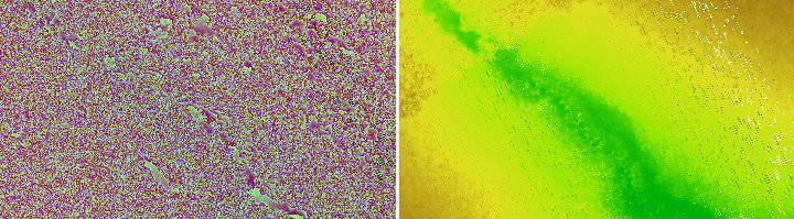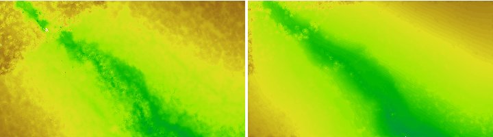 It can clearly be seen, that the right grid computed from the last echoes is much smoother than the one derived from the first echoes, as the first echoes contain all the reflections from the vegetation.