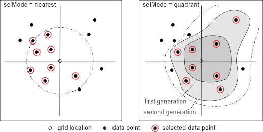 Possible values: nearest .... pure nearest neighbour (nn) selection quadrant ... quadrant-wise nn selection, ie. nn per quadrant, then 2nd nn per quadrant, ...Please note that quadrant wise data selection on the one hand reduces extrapolation effects, but on the other hand decreases the processing performance