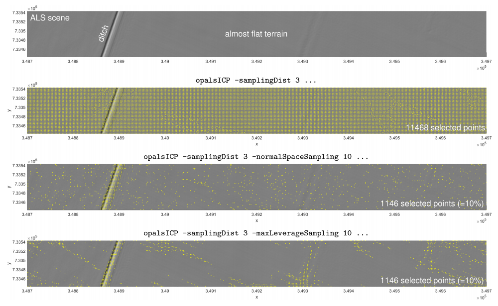 A comparison of the selection strategies offered by opalsICP is given in Figure 8. For most ICP variants, this ALS scene is rather difficult because only one feature - the ditch - can constrain the transformation at the finest level. Since normal space sampling and maximum leverage sampling consider the usefulness of points for the alignment process, the number of points can be dramatically reduced, without affecting the solubility of the adjustment. Further information can be found in Glira et al. 2015.