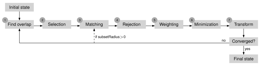 After step 7, a convergence criterion is tested. If it is not met, the process restarts with a new iteration from step 1 (Figure 1). However, if subsets are defined by the parameter subsetRadius, the iteration loop restarts from step 3 and the first two steps are only performed once. The total number of iterations heavily depends on the initial orientation of the points clouds, but typically, between 3 and 10 iterations should be sufficient to reach the global minimum.
