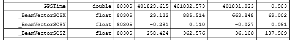 Possible values: BeamVector ...... Beam vector in the world coordinate system BeamVectorSCS ... Beam vector in the sensor coordinate system Range ........... Measurment range ScanAngle ....... Scan angle as defined by LAS standard PanAngle ........ The pan angle is the rotation of scanner head around primary axis of scanner. In case of a 1-D scanner, this is the varying angle around the only axis of the scannerIf trajectory files are provided, the module computes and attaches the specified beam information to each imported point.