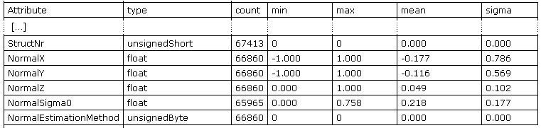 will show the newly added attributes (c.f. Figure 2). The statistics also reflect the number of successful computated plane estimations (For NormalSigma0 even less values have been set, since redundancy is required for its computation).