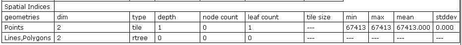 The last section of the module output covers information of the spatial index (c.f. Figure 3). The spatial index statistics is also reported after importing a data set, since it is crucial for processing the ODM. For further details please refer to section Analysing the index statistics of an ODM.