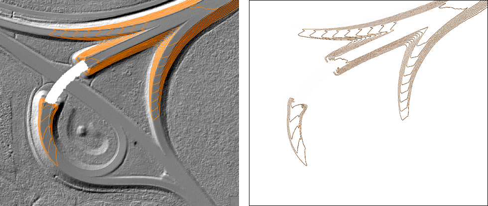 It produces contour lines from the DTM flyover_dtm.tif with an equidistant interval estimated from the z-range of the DTM. The interval is estimated and rounded to a commonly used interval out of 10, 20, 25, 50 times a power of 10. In this case opalsIsolines estimates an interval of 1 m, which is fairly suitable. But typically one will specify an interval customized to the project (like in the first example).