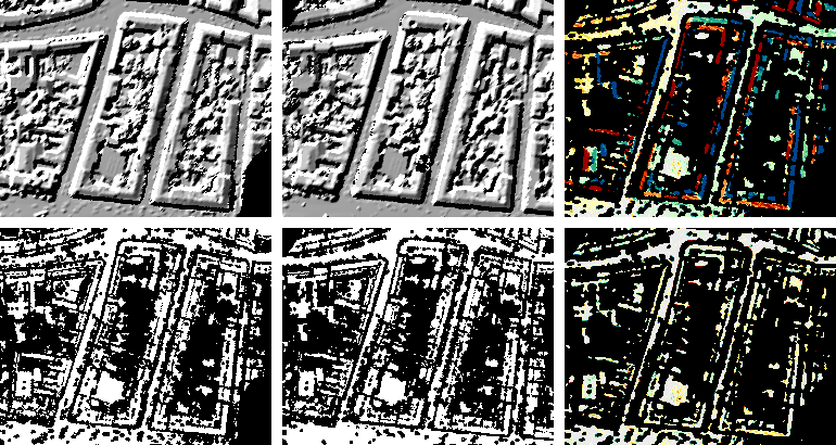 The basic input for Module LSM are the surface grid files of two overlapping ALS strips (parameter inFile) and, optionally, corresponding binary grid mask files (parameter gridMask) indicating areas which should not be used during LSM (due to vegetation and/or occlusion). Grid masks can be derived by means of module Module Algebra. The following figure illustrates the effect of using grid masks for the LSM computation.