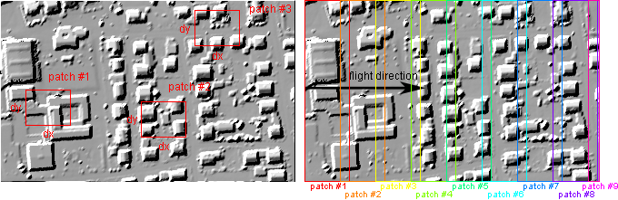 Least-squares matching (LSM) is a traditional photogrammetric technique for establishing the correspondence of (aerial or terrestrial) images taken from different view points. In Module LSM, this technique is applied to ALS surface models (DSM/DTM) in regular grid structure. The basic idea of LSM is to find the corresponding location of a surface patch inside a window of one dataset in another dataset. This is achieved by estimating the parameters of a predefined type of transformation so that the difference between the two datasets inside the patch are minimized. Whereas the patch size is limited to small windows in case LSM is applied to images (due to different viewing directions and the perspective image projection), much bigger areas can be used for the investigation of two overlapping ALS strips because the strip surface models represent an orthogonal projection (thus, each strip has the same viewing direction). This even enables the derivation of quasi-continuous 3D-shifts along the flight path of approximately parallel ALS strips covering the entire strip overlap area.