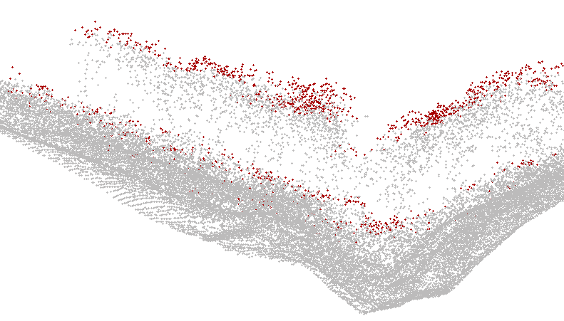 Making use of the new attributes within a filter, tree canopy points can be e.g. exported into a LAS file. The following command exports all points with a local hight spread of at least 5 [m] and a relative position withon the search sphere of more than 90% as tree canopy points into pts_canopy.las. By simply inverting the defined filter all other points are written to pts_rest.las: