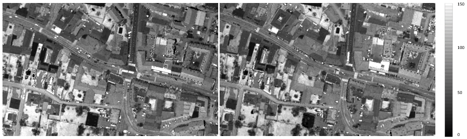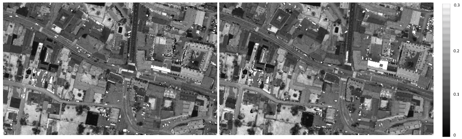 To check the results, we can e.g. create amplitude maps (Figure 2) and reflectance maps (Figure 3) for the two point clouds, before and after the radiometric calibration respectively: