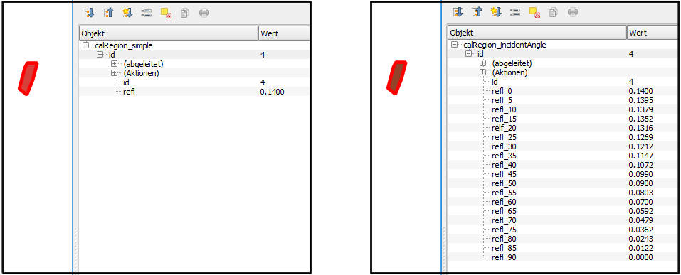 Reflectivity values and geometry information are matched based on the given ids (2 digit winput code + 4 digit structure line number). As shown below each region is represented as column within the reflectivity text file (excerpt of $OPALS_ROOT/demo/calRegion_reflectivity.txt). For Lambertian surfaces only the zero incident angle row has to be provided.