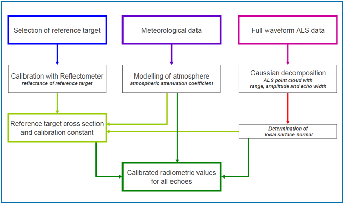In a second run of Module RadioCal the calculated calibration constant is applied to the entire point cloud and calibrated radiometric values are obtained for each echo. This process includes the estimation of the backscatter cross section, backscattering coefficients and incidence angle corrected values. The workflow for the absolute radiometric calibration of an ALS dataset can be summarized in the following figure: