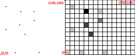 The following image shows a simple point to raster conversion. Different colours represent different z values of the rasterized points. If the raster is binary (default) the raster pixels will be 0 or 1. The Example 1 shows an raster image of a small LiDAR dataset.