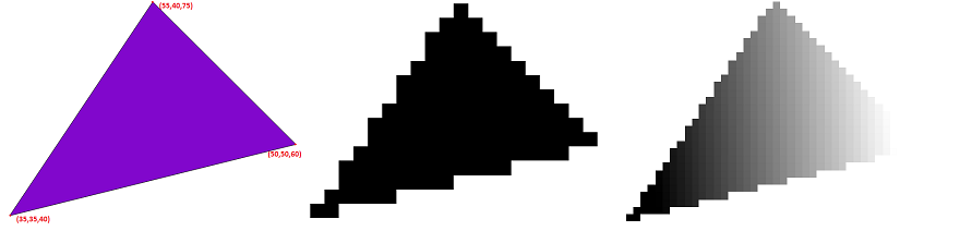 As it can be seen below, polygons can also be rasterized by the module. Whereas rasterization of polylines with attribute z is straight forward, things get complicated for polygons since it's not directly possible to linear interpolate value for pixel inside the polygons. The implemented algorithm builds a Constraint Delaunay Triangulation from the polygon and rasters relevant triangles. Doing so it is possible to linear interpolate value for the inside pixels. The following figure shows a simple polygon using fixed value (centre) or variable values (right) burning.