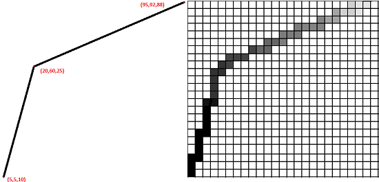 Whereas Module Cell can be equally used for rasterzing point coulds, the rasterize module is also able to rasterize polylines. Polyline rasterization with defined attribute is shown in the following image. The shown polyline is defined by three points. The module interpolates between the line vertices in a linear manner.