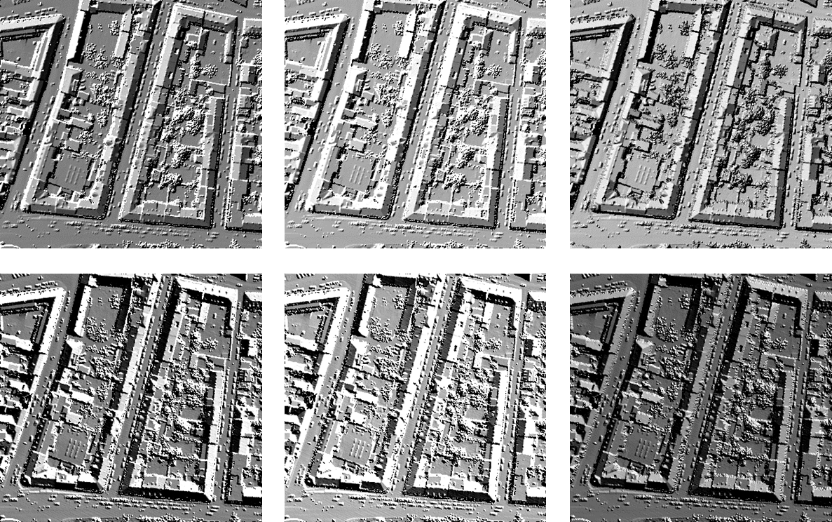 Now we can use Module Shade to compute hill shadings from this DSM using the following commands. We specify the input grid, the resulting raster image file, the shading algorithm, and the virtual sun position.