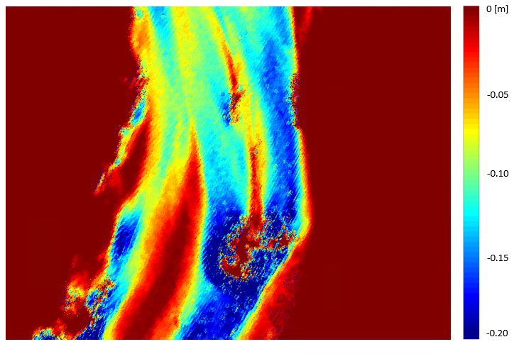 It is observed that all of the differences are negative, which implies that the corrected points have higher values of Z, and therefore smaller depths, as expected. This is due to the fact that the raw water depths are overestimated as a matter of not considering the reduced propagation speed of light in water. In addition, the dark red regions, that have a zero value, are non water regions. So, there were no corrections applied to them.
