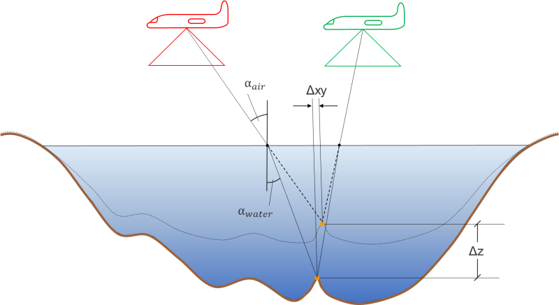 More specifically, according to the principle of ALB, a short green laser pulse ( \(\lambda = 532 nm\)) is emitted from an airborne platform, travels through the atmosphere, and hits the water surface where it gets refracted towards the plumb line. Within the water column the laser beam propagates with reduced velocity and is scattered at water and sediment particles. A part of the signal is reflected from the bottom of the water body, and, after the return trip, the full waveform of the backscattered echo signal is detected at the receiver. Beam refraction as a consequence of the different propagation speed in air and water is described by Snell's law (Willebrord Snellius) as:
