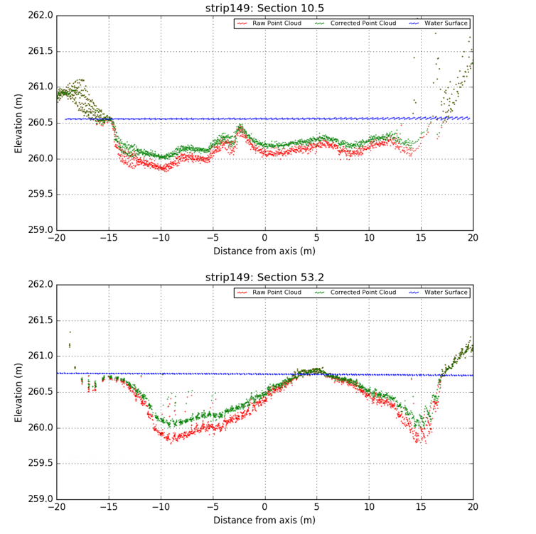 Fig. 4 shows the two point clouds with respect to the water surface, as that was extracted from the water surface model. It is obvious that when the points are over the water surface, the two different datasets coincide since there is no range correction. In addition, one can see that the range/refraction corrections are higher in deeper waters.