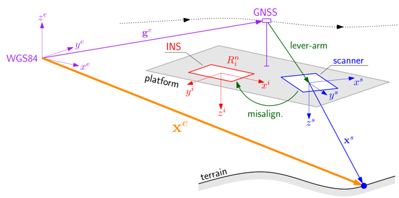 Figure 2: Direct Georeferencing of ALS multisensor data. The scanner observes a point on the ground in its own system, with the platform position determined by the GNSS antenna and its attitude by the INS.
