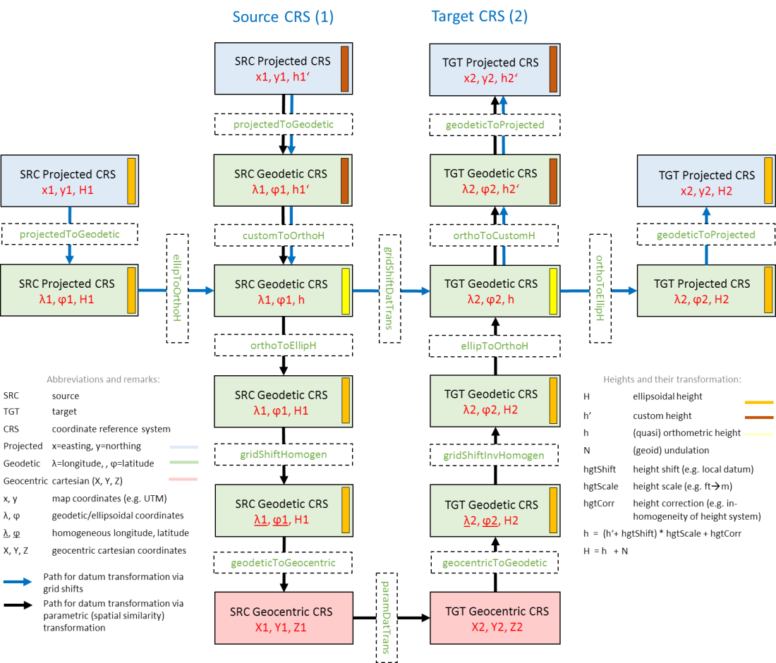 Starting from version 6.0, the PROJ library supports a flexible framework for constructing user-defined transformation pipelines. Built around this so-called "CoordinateOperation" feature, Module Translate offers a generic way for transforming data between different CRS including datum shift, change of height system, and gidi-shift based correction of inhomogeneous reference systems. The possible transformation paths are depicted in the following Figure 1.