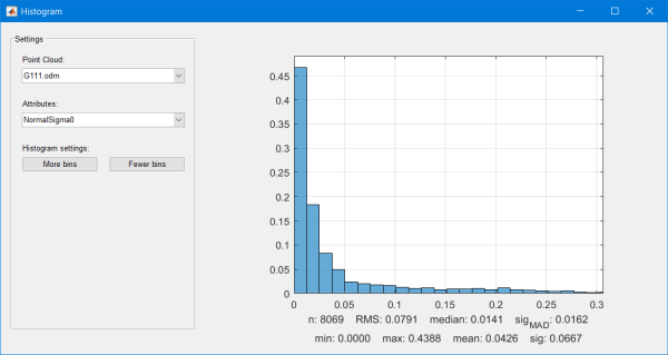 Coloring and lenght of the normal vectors can be adjusted in the options. A histogram of the currently displayed points can be opened with the histogram button in the toolbar of opalsView: