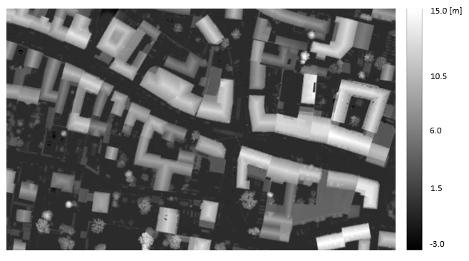 A way to facilitate the interpretation of a DSM is to derive the normalized DSM (nDSM). A nDSM is the difference model "DSM minus DTM" and, therefore, represents heights above the terrain. In this example, it is shown how to create the nDSM, when the DTM is provided. The DSM is derived again from the six .laz files used previously in Example 4 and the DTM is already provided in the $OPALS_ROOT/demo/ directory.