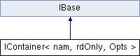 Inheritance diagram for IContainer< nam, rdOnly, Opts >:Public Types | |