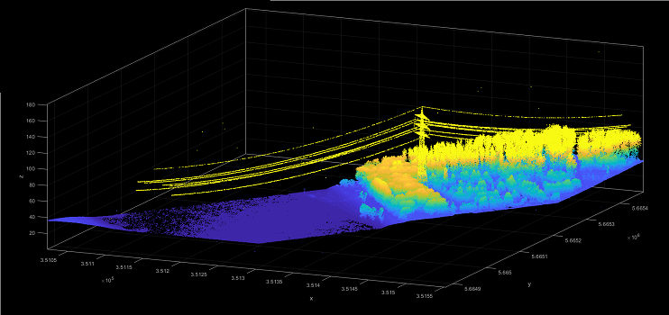 Linearity value can show if a point is on a line. However, high linearity values not only represent power lines but also other linear objects such as trees in the data. Module Segmentation is used to find points which has very high linearity and small angle between the first eigenvector (=direction of largest extend of neighbouring points) in the local neighbourhood.