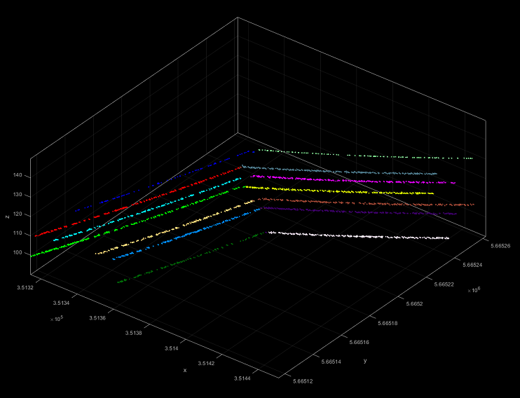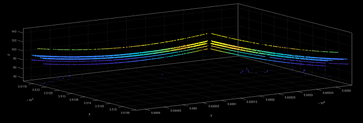 The LiDAR measurement technology is well suitable for capturing electricity infrastructure. In particular power lines and power poles are often measured using airborne LiDAR platforms mounted on helicopters or planes. In case of smaller areas of interest also drones can be utilized. As shown in this use case below, OPALS can be used to classify cable points in a straightforward manner that were captured from a plane mounted LiDAR system. Those cable points are further segmented into individual parts between poles (this information allows estimating the sag of the cables, which is an important quality measure of the cable). Moreover, insulator and pole points can be segmented providing the geometric location of those objects.