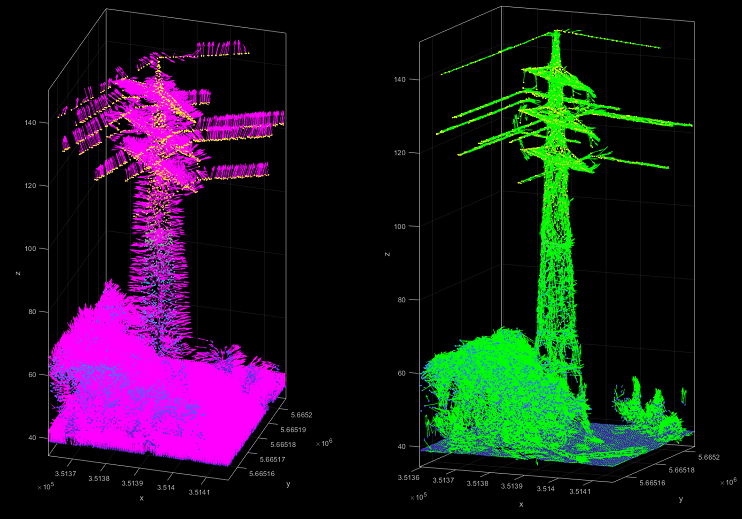 In the first segmentation, some power line points cannot be found but reliable power line points are detected as seen in Fig. 4. While normal estimation is performing, according to number of neighbours and search radius, normal vectors and eigen normal vectors are affected by position of neighbour points. Furthermore, linearity is also affected by these facts. Therefore linearity is getting reduced araund tower where normal vector direction changed dramatically. Considering the fact that reducing linearity, most of the lost powerline points are expected to located araund tower. To detect lost power line points, Module PointStats is used. On the other hand, in some cases power line points does not have high linearity value.