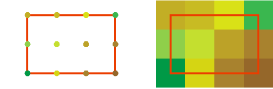 Note that, the centers of the border pixels are lying on the limits. Therefore, the area covered by the pixels exceeds the limits of the ROI by half a column in east and west, and also by half a row in north and south. If only a single ROI is considered, then this exceeding is of no concern, usually. However, the exceeding may be unwanted in case of tiles. Tiles are rectangular ROIs, which are used to partition a larger area like a whole country into smaller parts for easier handling. Neighboring tiles do not overlap but lie gapless side by side. Therefore, also the color coded tiles of the DTM may be wanted to lie gapless side by side. For this purpose the raster image of the color coding should be created inscribed, so that the edges (and corners) of the border pixels lie on the ROI limits.