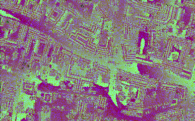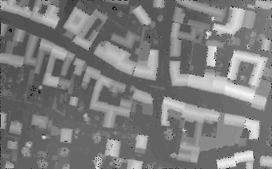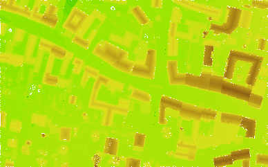 Since the grid file contains the DSM heights as 32-bit float values, the image looks a bit strange. When using a GIS viewer, like QGIS, we can easily get e.g. a greyscale representation of the DSM. However, OPALS provides Module ZColor to create color coded raster maps (8-bit palette files). Z-colouring is basically a classification task. The translation of height values to colour classes is controlled by palette files. If no specific palette file is at hand, the built-in 'green-yellow-brown' palette is automatically used. The command: