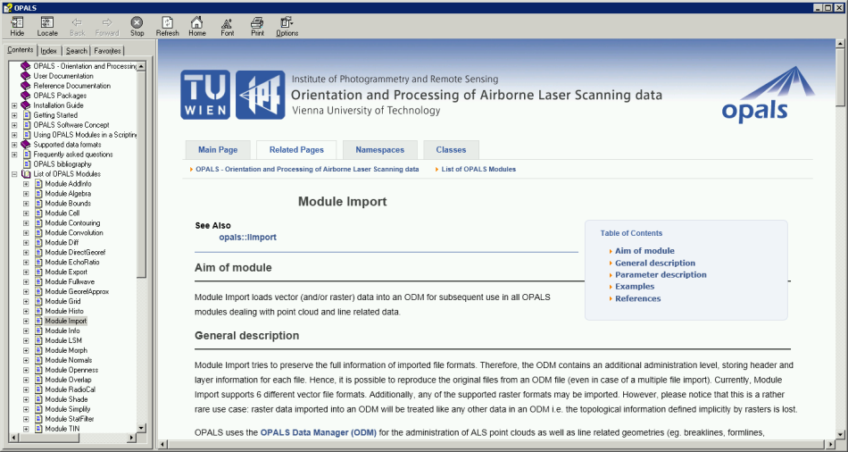 OPALS stands for Orientation and Processing of Airborne Laser Scanning data. It is a modular program system consisting of small, well defined components referred to as 'modules'. Each module is accessible in three different ways: