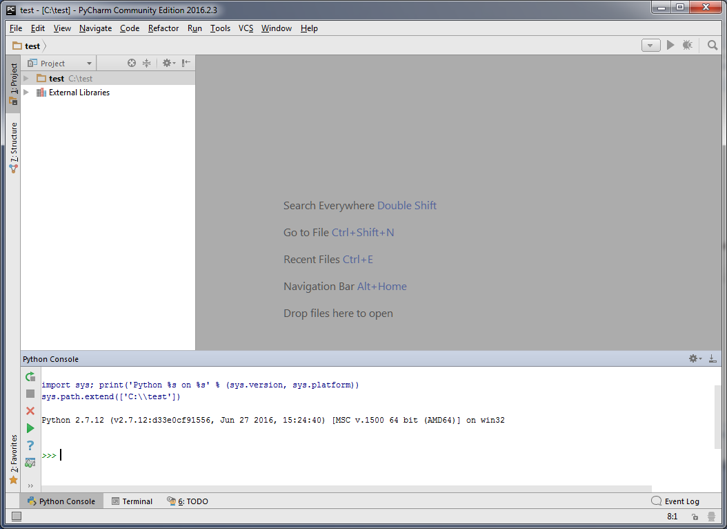 python in an OPALS shell$OPALS_ROOT/opals/python.exeHowever, there are enhanced Python shells available, which provide useful features like code completion, syntax highlighting, and call tips. OPALS has an addon for the Python integrated development environment (IDE) PyCharm which, among other things, features such an interactive shell. This addon has to be downloaded from the Downloads section individually. Double-clicking on $OPALS_ROOT/addons/PyCharm/startPyCharm[.bat|.sh] opens up this IDE, where you can choose to open an exisiting project or to create a new one. For details on the first time startup, refer to First time start of PyCharm . In the main window, you can open the interactive shell at the bottom by pressing the "Python Console" button.