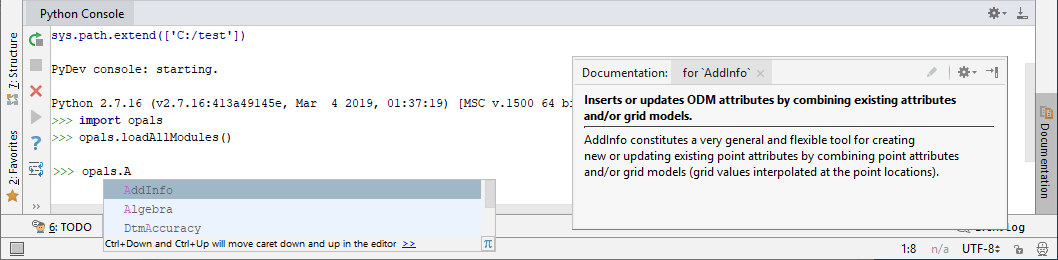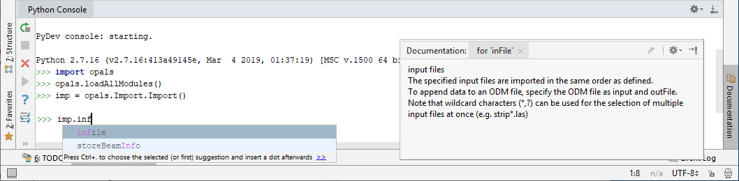 To import ALS data files into the ODM within Python, just as in the previous subsection using the command line executables, the following steps are necessary. First, we have to make the respective OPALS module available. opals is the name of the Python package containing all available OPALS modules. Using PyCharm's tooltip feature, the list of available OPALS modules can be displayed by typing:
