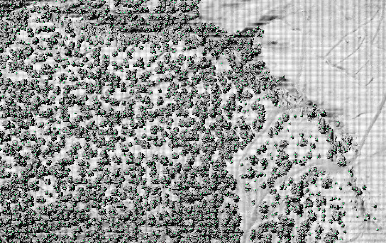 Figure 1: Each green point represents a detected tree; hillshaded DSM in background for reference