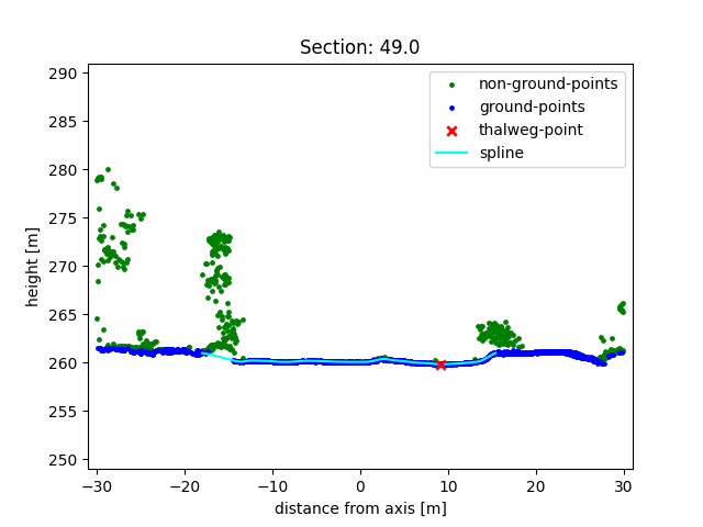 Figure 2 shows a cross-section plot at a stationing of 49.0 m extracted from strip149.las. The classification, the spline restriction and the thalweg point are well recognisable.