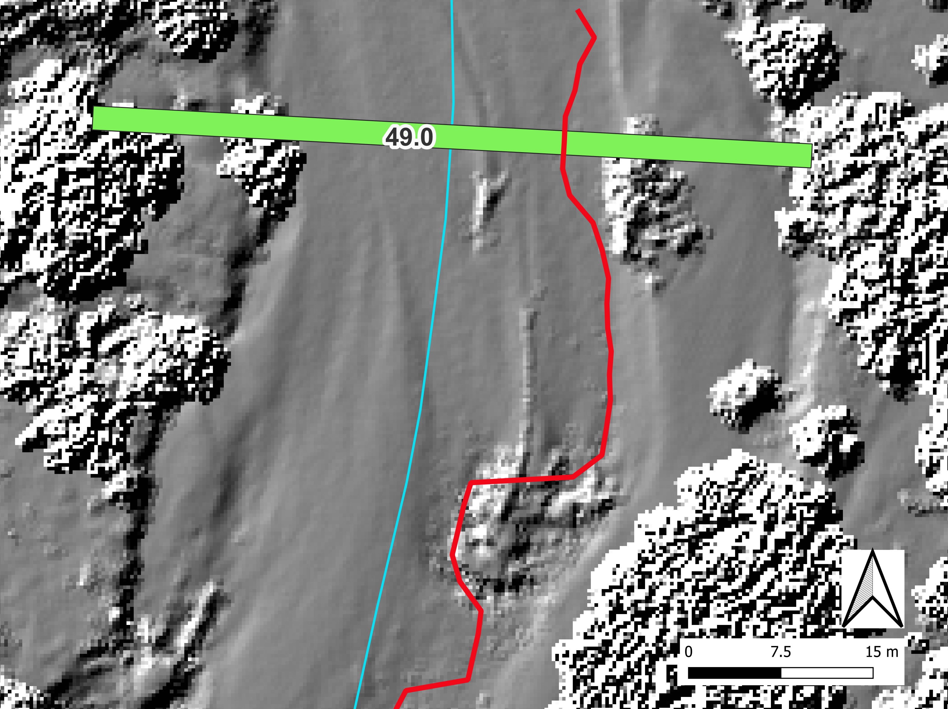 Figure 5 depicts the thalweg of the river section in strip149.las derived without classifyGroundPoints and waterSurface. There are noticeable differences to the thalweg in figure 3 in the lower half of the image.