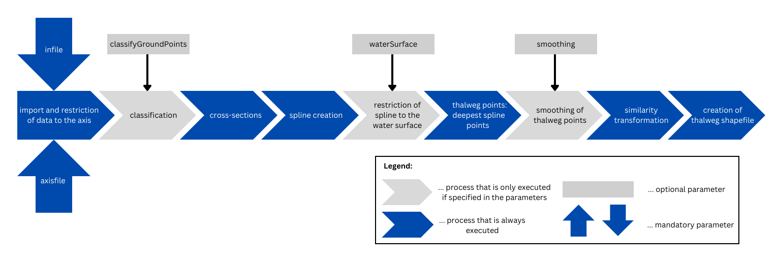 The implementation of this script is based on datasets derived from Airborne Laser Bathymetry (ALB) using topo-bathymetric scanners. As ALB can penetrate water, a topo-bathymetric scanner creates a 3D point cloud which contains reflected points from the terrain around the river as well as from the riverbed. However, only riverbed-points are essential for the thalweg computation.